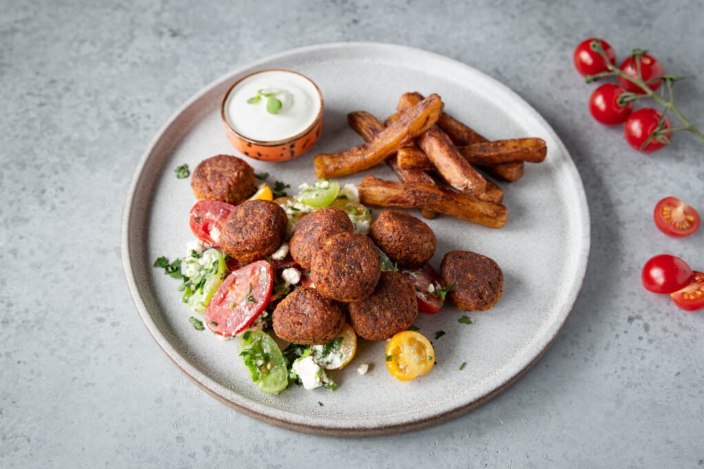 Gråärtor 41 %, tomat, ris, lök, rapsolja, potatisflingor, rismjöl, vitlök, örter (koriander, timjan, oregano), kryddor (paprika, spiskummin, svartpeppar), salt, socker, stabiliseringsmedel (E461).