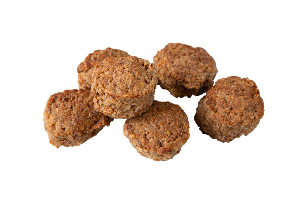 Nötkött 34 %, gråärtor 23 %, potatis, ÄGG, lök, vatten, potatisfiber och -mjöl, mineralsalt (salt, kaliumklorid), kryddor (svart- och kryddpeppar, paprika, koriander, gurkmeja, bockhornsklöver, spiskummin, fänkål, ingefära, cayenne), stabiliseringsmedel (E450), färgämne (E150c), rapsolja.